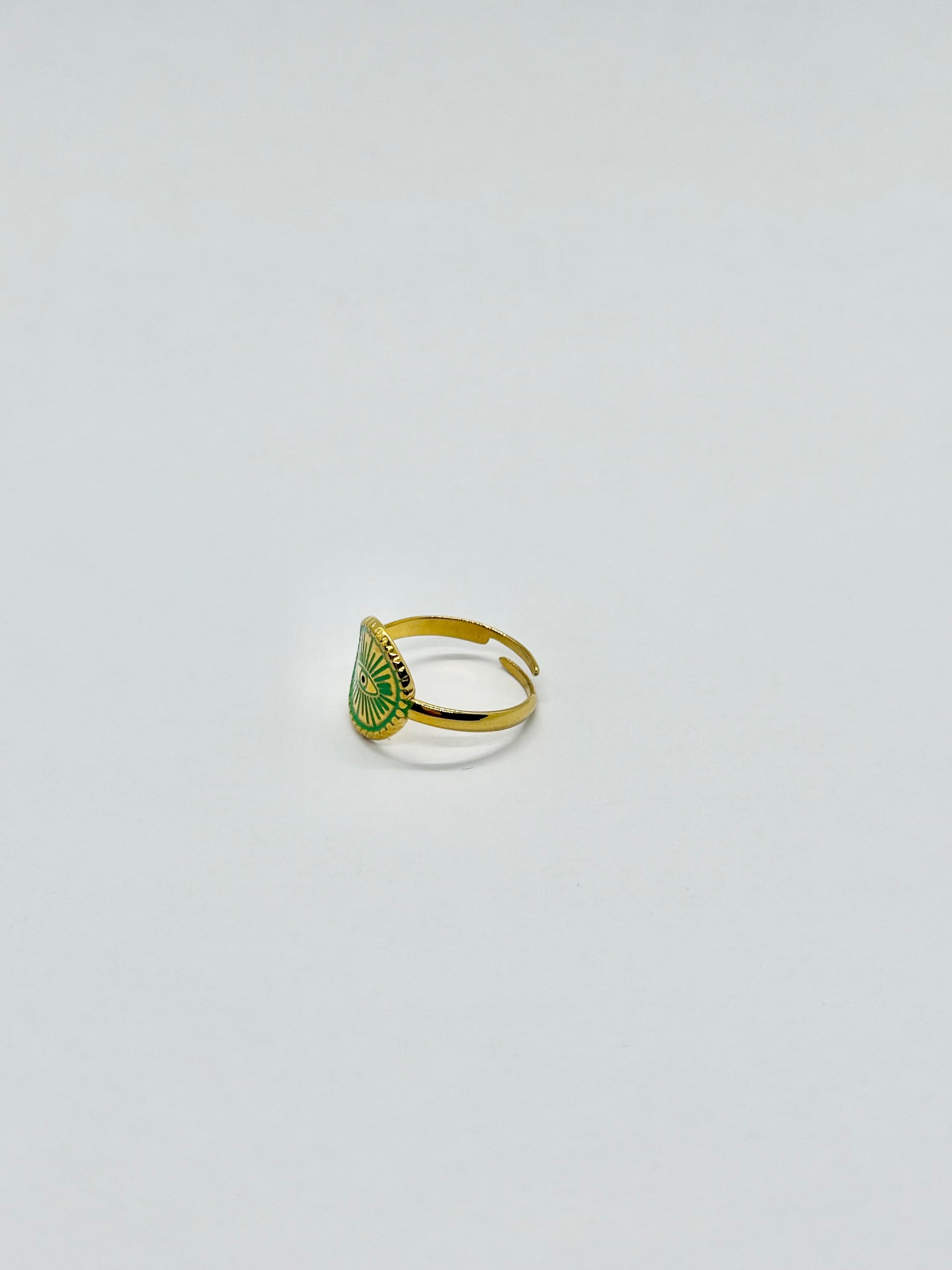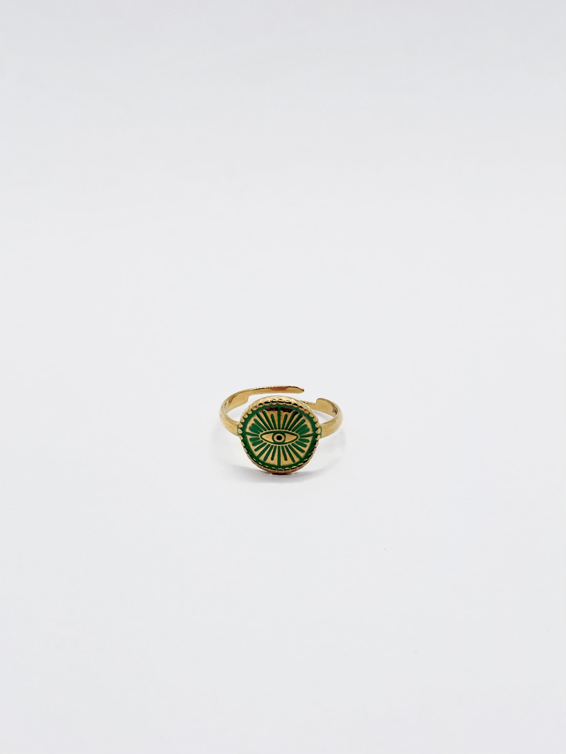 Elegante e simbolico, questo anello in acciaio inossidabile dorato unisce la profondità del verde, rosso, azzurro al design unico di un occhio stilizzato. Un accessorio raffinato, resistente e ricco di significato, perfetto per chi ama distinguersi con stile.