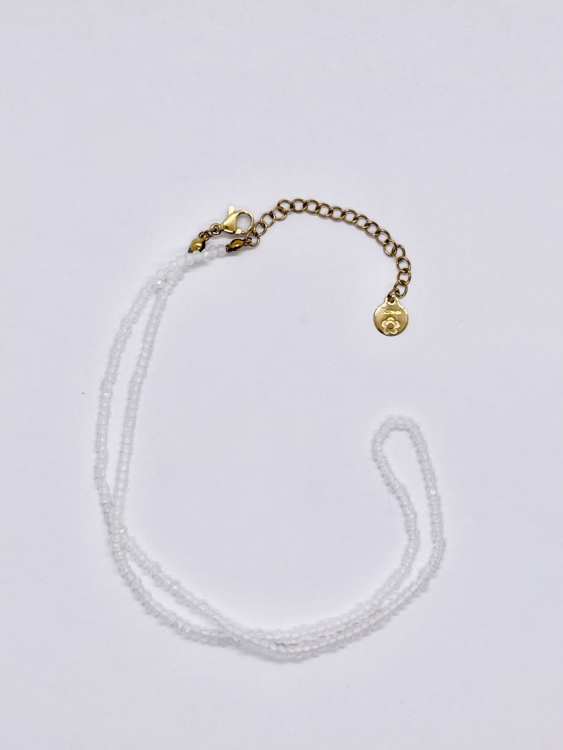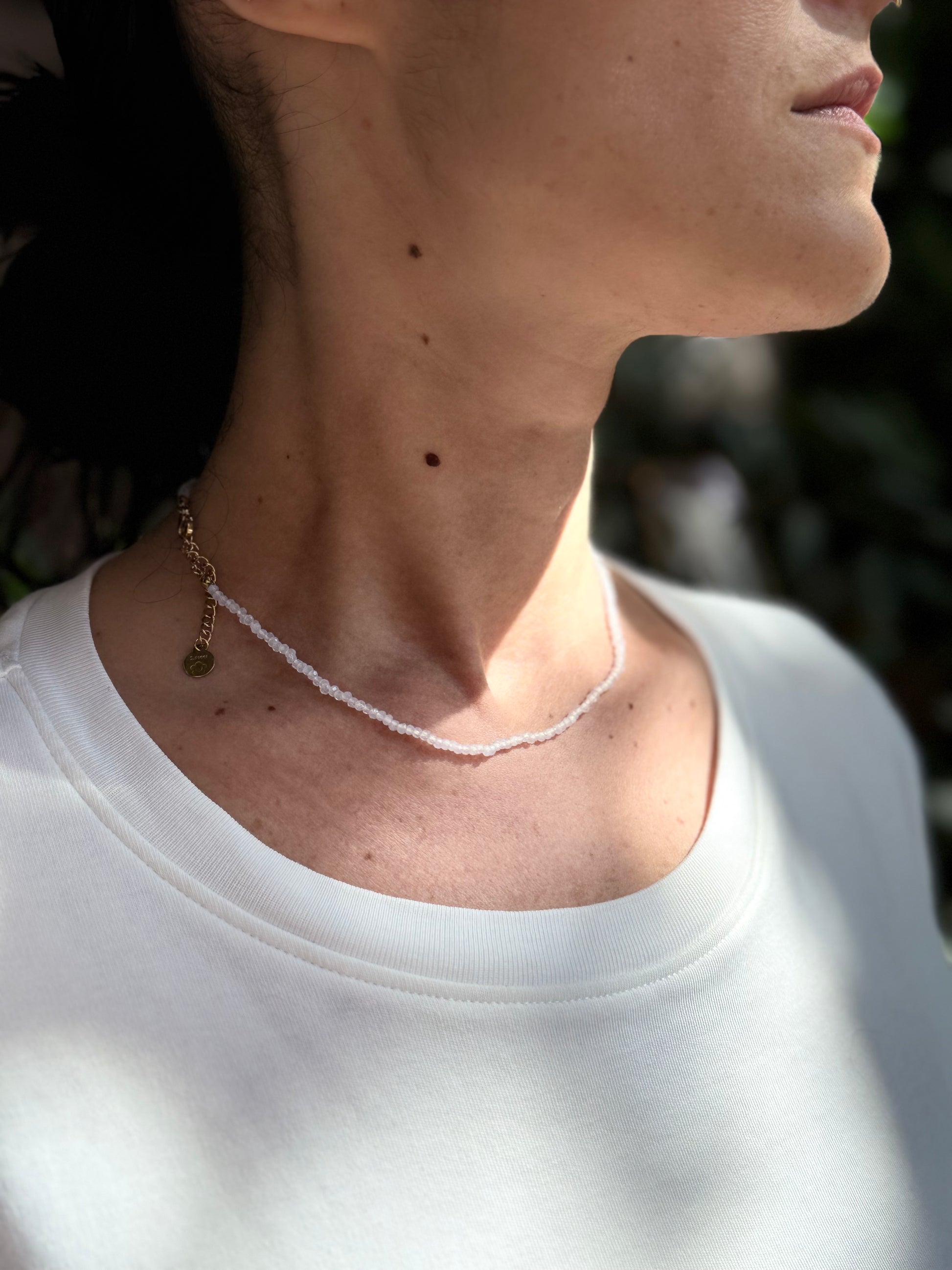 La collana Pura è realizzata con pietre di agata trasparente e rifiniture in acciaio inossidabile. Il colore bianco le dona un aspetto luminoso e delicato. Elegante ma discreta, è perfetta da indossare ogni giorno o per un’occasione speciale.